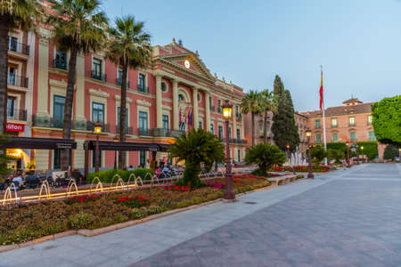 MURCIA, SPAIN, JUNE 19, 2019: Sunset view of town hall in Murcia, Spain