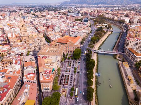 Aerial view of part of european city Murcia with coast line of segura river, Spain
