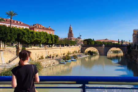 girl on bridge watching the safe river as it passes through murcia