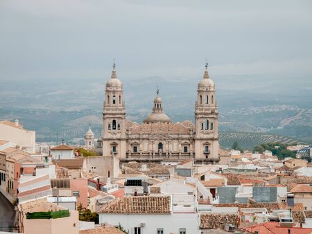 Infrequent view of the Cathedral of the Asuncion in Jaen, Andalusia. Front view of the monument with the building surrounding it