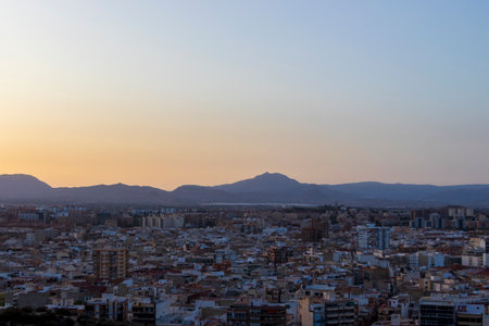 Panoramic view of Alicante city at sunset featuring residential buildings and mountainous backdrop. Tranquil atmosphere showcasing urban living and natural beauty.