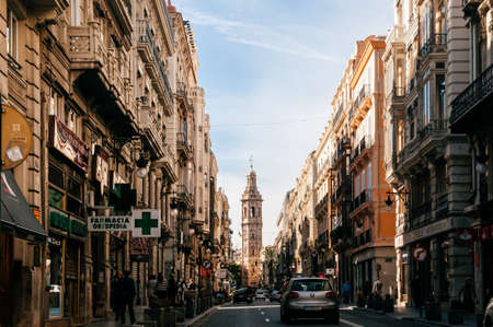 OCT 29, 2012 Valencia, Spain - Ancient Bell tower of Esglesia de Santa Caterina church seen from street view along with old building in Valencia city center