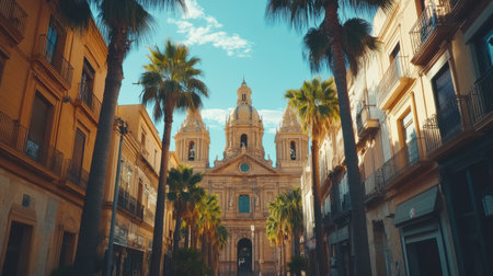 A sunlit plaza with elegant historic architecture showcases a grand building framed by vibrant palm trees under a clear blue sky, creating a scenic atmosphere.