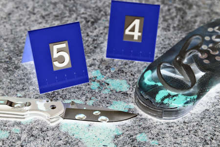 Crime scene investigation, Bloody knife and victim's shoes with criminal markers on ground, Homicide evidence.