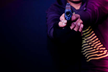 asian man holds a gun. Gun in his hand from the back isolated on black background.