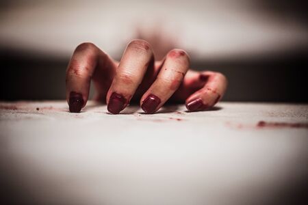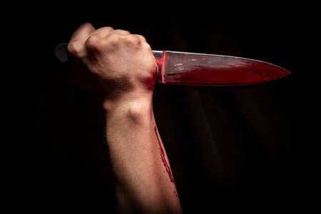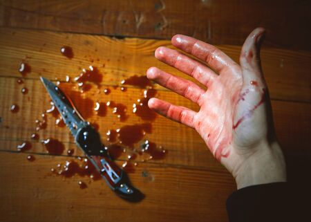 Murder scene for cutting weapon, gory hand along with a knife with blood, conceptual image