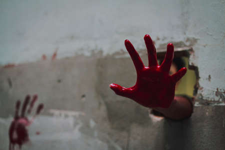 Halloween and horror concept. bloody hand in abandoned house. Photo with grain.