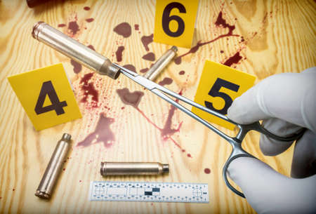 scene of crime, Scientific police picking up bullet cap with tweezers, rule of ballistic measurement, conceptual image, horizontal composition