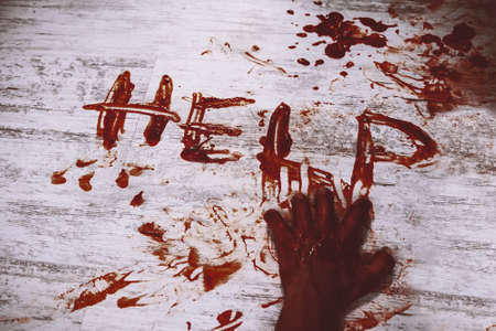 Says help, written in red blood on the dirty white floor of the bloody hand. The murder victim asks for help.