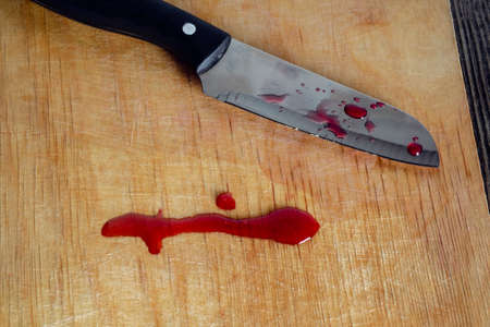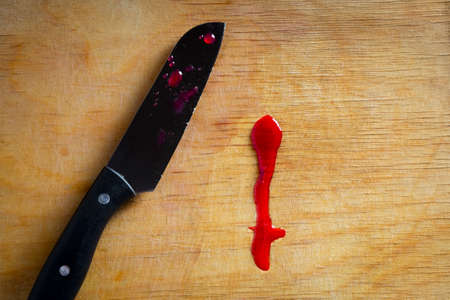 Drops of blood or red juice on an old dirty kitchen cutting board with a knife close up. The concept of domestic trauma.