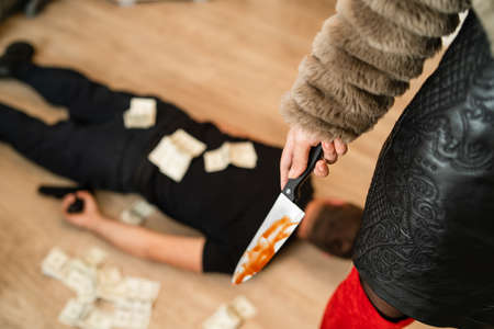 Close up on midsection of unknown woman female murderer holding bloody knife with unknown man lying dead on the floor stabbed with money banknotes around domestic violence human trafficking concept