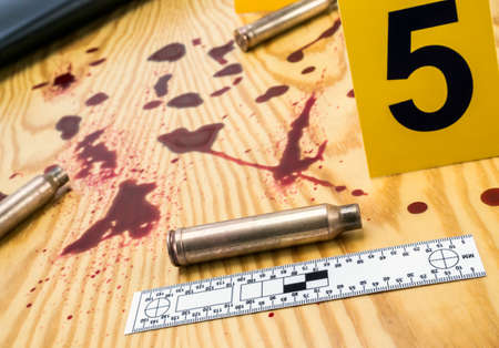 Crime scene investigation, Bullet shell with blood stain against the crime marker on the ground.