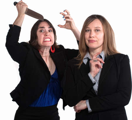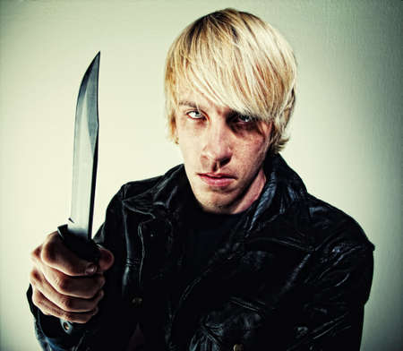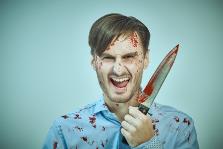 A crazy man, a homicidal maniac, screams furiously and holds a bloody knife. Thriller, horror. Light studio background.