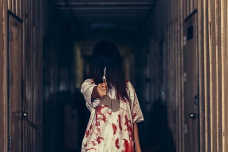 horror scence of women hold knife by hands with blood. Ghost women wear white dress stain blood at abandoned house