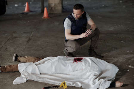 Young man in bulletproof vest sitting on squats by covered dead body lying on asphalt in parking area during detective investigation