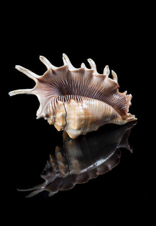 Close-up shell with reflection on black background. Studio shot of a Mediterranean sea shell