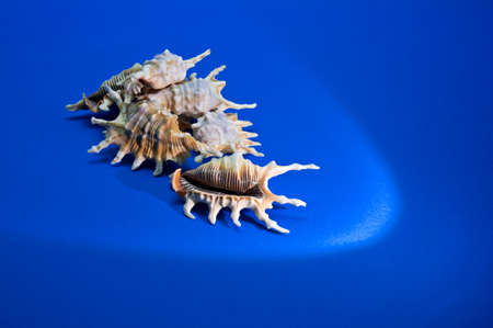 Beautiful seashell resting on a blue surface on smooth gradient background