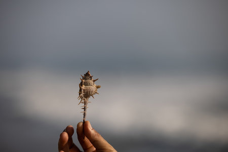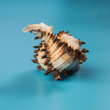 Beautiful brown white sea shell on the white background. Artistic photography. Selective focus