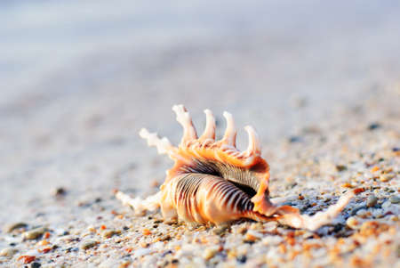 Sea shell lies on the sandy seashore in the rays of the setting sun