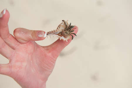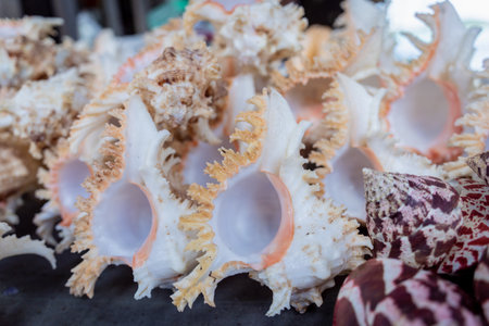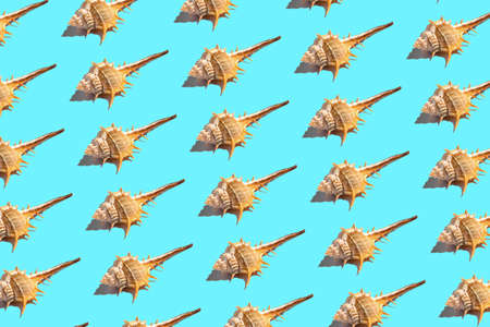 Closeup view of an arrangement of spiny seashells from marine snails or gastropods on sand viewed from above