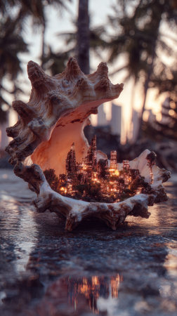 A surreal artistic rendering showcases a detailed seashell harboring a miniature city illuminated from within. The composition features warm tones, soft textures, and shallow depth of field, with reflections on a wet surface. Suitable for conceptual design, decorative purposes, and visual content for various media.