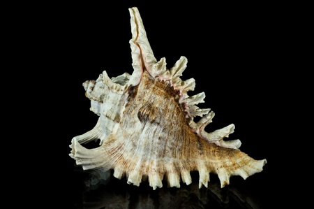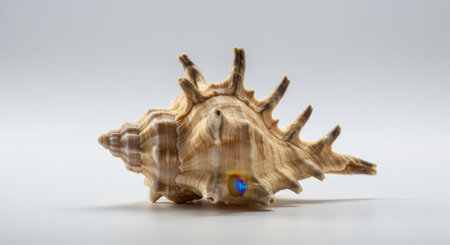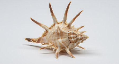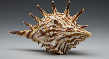 A detailed studio shot showcases the intricate details of a spider conch shell The shell boasts a mesmerizing pattern of brown and white stripes carefully arranged to create a visually appealing design Projecting from the shell are numerous spikes adding to its unique texture and character This image is perfect for educational materials scientific research or anyone with an appreciation for the natural worlds beauty and complexity The neutral background accentuates the shells striking form and color variations