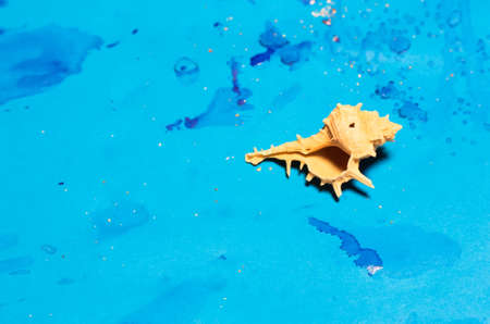 A white conch seashell on a blue background close-up flatly. Blurry watercolor spots on paper. Marine theme. Place for text.