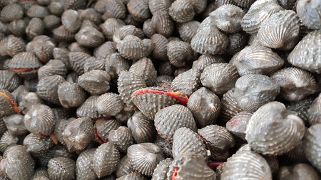 Fresh cockle in the market.cockles seafood, pile of​ fresh blood cockles top view, cockles or scallop fresh raw shellfish