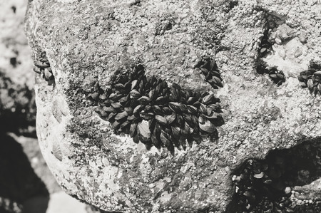 Vintage photo of Greenshell mussels colony on the rock. Close up