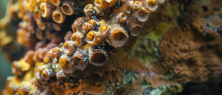 This captivating macro shot unveils the intricate details of a coral reef adorned with barnacles, creating a unique and fascinating structure. The image showcases the close-up view of barnacles firmly attached to the reef, their individual shells forming a mesmerizing tapestry.