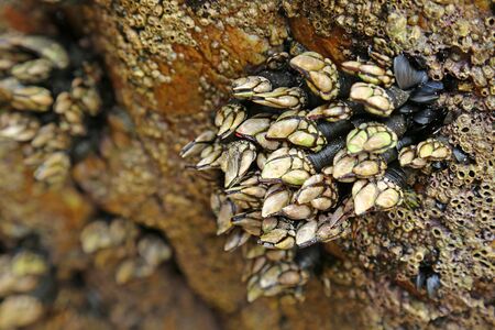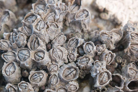 Barnacles encrusted on sandstone rock at beach. Close up.