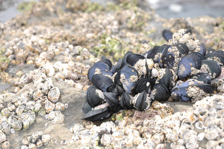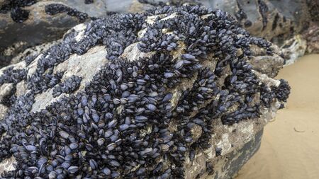 Mussels on rocks in Carnewas and Bedruthan Steps north Cornish coast between Padstow