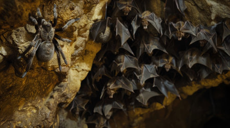 A replica of a dark eerie cave home to a giant tarantula and a group of sleepy bats hanging from the ceiling