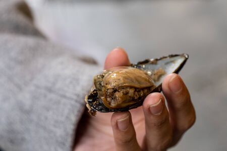 Freshly caught wet raw mussel covered with multicolor growths on wooden table. Close-up view.