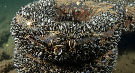 An underwater close-up of a rusty pipe or metal object completely encrusted with a dense colony of invasive zebra mussels. The image highlights the environmental issue of invasive species in freshwater ecosystems.