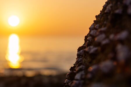 a blur colorful sunset background with shell on the rock closeup, abstract nature