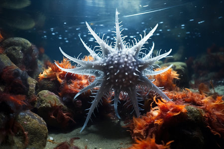 A close-up of a sea urchin resting on the ocean floor, with its spiky exterior and colorful details prominently displayed.