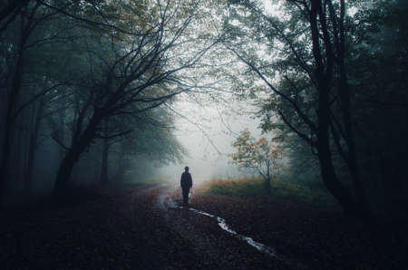 Silhouette of man in deep dark haunted forest with fog