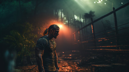 Portrait of a man in the middle of the jungle at night.
