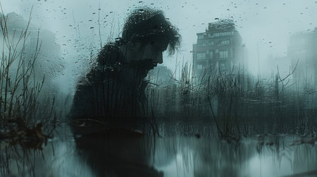 a fog-soaked swamp in a misty evening, devoid of trees, resembling intricate underwater worlds. this national geographic photo captures the grim realism of environmental activism. the scene is dominated by a palette of light teal and black, with rusty debris adding an eerily realistic touch. ai generated