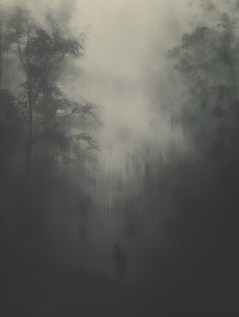 Silhouetted pine trees stand in a misty forest, creating an atmospheric and ethereal landscape. The fog obscures the background, adding depth and mystery to the scene.