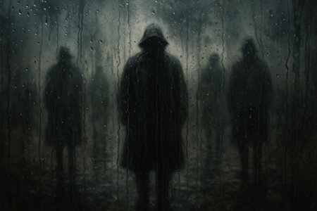 Mysterious figures standing in rain viewed through glass window. concept of mystery, rainy weather, eerie scene.