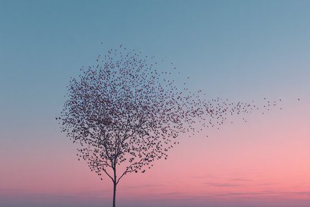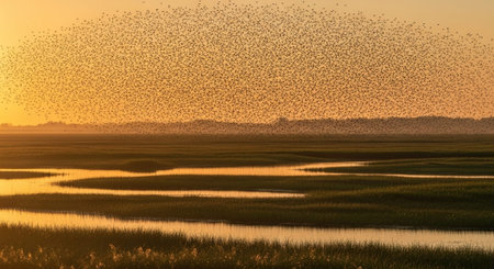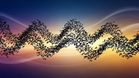 Flock of birds forming a wave pattern against a gradient sky Clear details and vibrant colors enhance visual a...