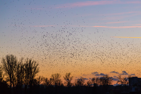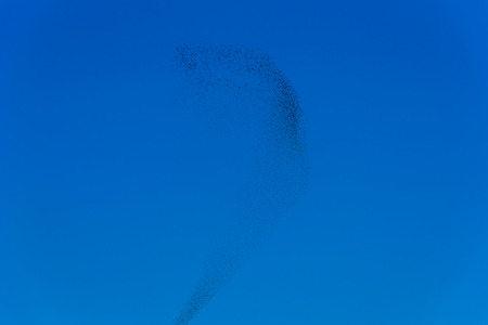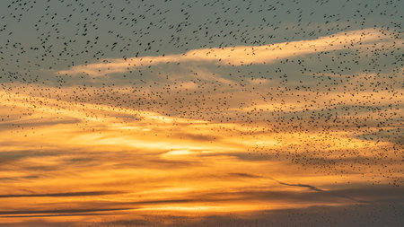 Beautiful large flock of starlings (Sturnus vulgaris), Geldermalsen in the Netherlands. During January and February, hundreds of thousands of starlings gathered in huge clouds. Starling murmurations.