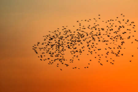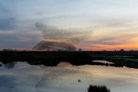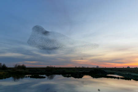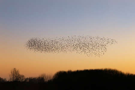 Starling murmurations. A large flock of starlings fly at sunset just before entering the roosting site in the Netherlands. Hundreds of thousands of starlings make big clouds to protect against raptors
