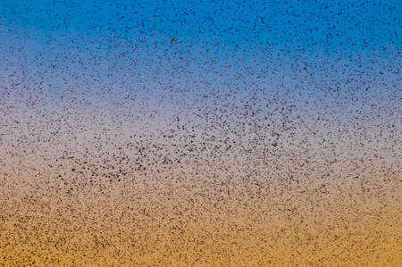 An abstract textured photograph of a big flock of Quelea birds flying against a blue sky at sunset in the Madikwe Game Reserve, South Africa.