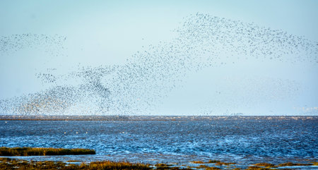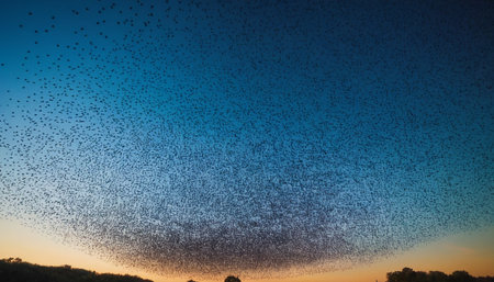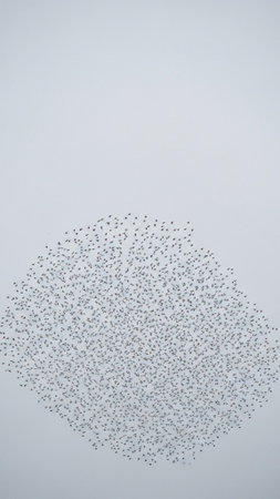 A dense flock of starlings in the sky, creating mesmerizing patterns as they swoop and dive in unison.