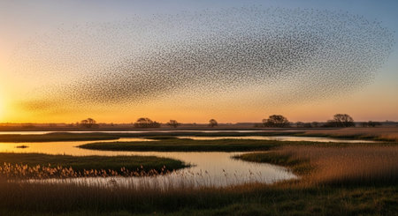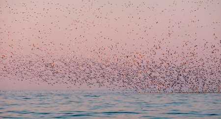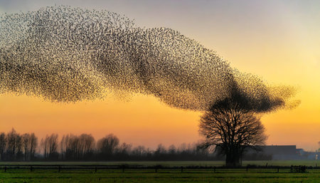 Flock of starlings flying in formation at sunrise in the Netherlands