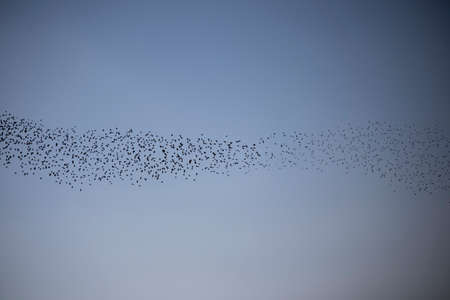 Beautiful large flock of starlings. A flock of starlings birds fly in the Netherlands. During January and February, hundreds of thousands of starlings gathered in huge clouds. Starling murmurations.