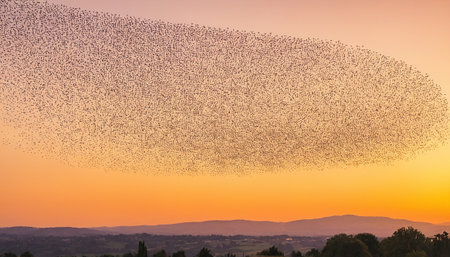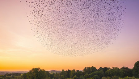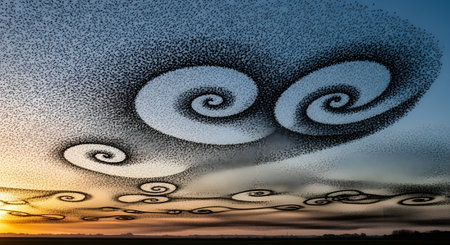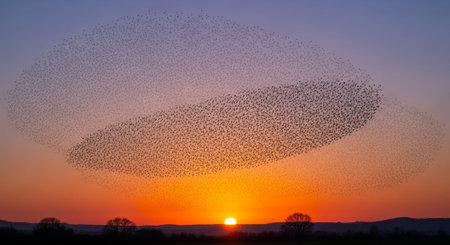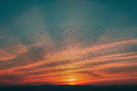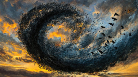 A breathtaking view of a massive starling murmuration creating intricate spiral patterns across the sky at sunset. The thousands of birds move as one entity against a beautiful gradient of orange and blue. This image captures the wonder of natural phenomena and collective behavior.